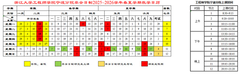教学日历说明:非全日制研究生请注意上课周次和上课时间安排,上课周次以宁波分院教学日历绿色标记为准,课程安排表内有标注具体时间的按照具体时间上课,其余课程按照“工程师学院宁波分院上课时间表”安排的节次与时间上课(法定节假日课程调整另行通知)。